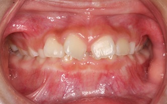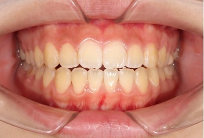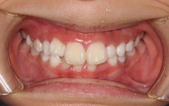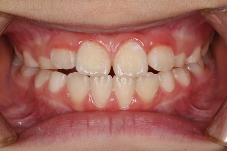 | 治療内容 | 8歳女児の叢生(乱ぐい歯)と反対咬合の難しい症例です。上顎の歯列の幅が極端に狭く尖った形をしている「強度のV字歯列弓」が特徴的でした。このため、永久歯が正しく生え揃うためのスペースが不足しており、土台からの改善が必要な状態でした。 上顎にファンタイプの急速拡大装置を用いて骨格的に幅を広げ、V字型の歯列を綺麗なアーチ状に改善しました。下顎は3Dリンガルアーチで拡大後、上下にブラケット装置を装着して歯並びを整え、治療を完了しました。 |